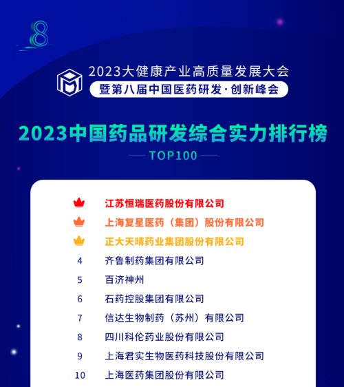 由药智网、中国药业杂志社主办的2023大健康产业高质量发展大会暨第八届中国医药研发•创新峰会于6月16日开幕,会上发布了《2023中国药品研发实力排行榜》系列榜单,DB真人医药凭借深厚的创新研发实力再创辉煌:荣登《2023中国药品研发综合实力排行榜TOP100》榜首、《2023中国化药研发实力排行榜TOP100》榜首。值得一提的是,今年是DB真人医药连续第6年入选《中国药品研发综合实力排行榜》榜首。