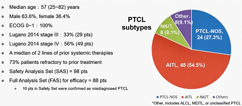 这是一项开放标签、2期注册研究(NCTO4705090),2021年5月至2022年10月,中国25家研究中心共入组98例患者。关键入选标准:1)年龄≥18岁,男女不限;2)经病理证实的PTCL,包括但不限于:PTCL非特指型(PTCL-NOS)、血管免疫母细胞性T细胞淋巴瘤(AITL)、ALK阳性或阴性间变性大细胞淋巴瘤(ALCL)、NK/T细胞淋巴瘤(NKTCL)、肝脾T细胞淋巴瘤(HSTCL)、肠病相关T细胞淋巴瘤(EATL)等;3)经过至少一次PTCL全身系统性治疗失败或不能耐受的PTCL全身治疗;4)对于复发难治性ALCL,需要包括抗CD30单克隆抗体(BV)在内的既往治疗,NKTCL以门冬酰胺酶为基础的方案治疗;5)ECOG评分0-1;6)至少有一个可测量的靶病灶(Lugano2014标准);7)充足的器官功能。林普利塞以80 mg QD(RP2D)连续口服给药,直至疾病进展、不可耐受的毒性或退出研究。